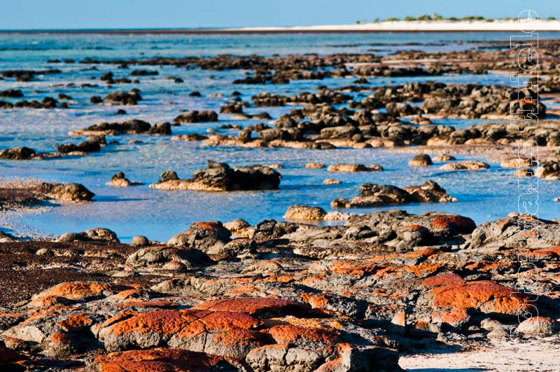 Das südlichste Ende der Shark Bay, der Hamelin Pool, ist weltbekannt durch seine Stromatolithen, Gesteinsbildungen, die durch Lebewesen entstanden sind, die es schon in der Urzeit der Erde gegeben hat. An einigen wenigen anderen Plätzen der Welt gibt es sie auch noch (z.B. Lake Thetis bei Cervantes, Bahamas), aber hier im Hamelin Pool sind sie am größten, schönsten und spektakulärsten. Erst 1956 wurden diese "lebenden" Stromatolithen von Wissenschaftlern entdeckt, vorher kannten sie diese Gesteinsbildungen nur als Fossilien in uralten Gesteinen.