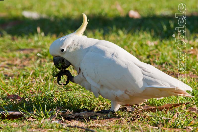 Besonderheiten gibt es auch im Bau des Fußes: von den vier Zehen zeigen die beiden äußeren nach hinten, die beiden inneren nach vorn. Mit dieser Anordnung der Zehen können sie kräftig zupacken und sie auch so wie Hände benutzen, um Gegenstände, z.B. Nahrung, zum Schnabel zu führen. Keine andere Vogelgruppe geht damit so geschickt um wie die Papageien. Genauso wie beim Menschen gibt es auch bei den Kakadus "Links- und Rechtshänder", d.h. eine Gruppe der Individuen benutzt immer den rechten, eine andere immer den linken Fuß zum Greifen von Dingen.