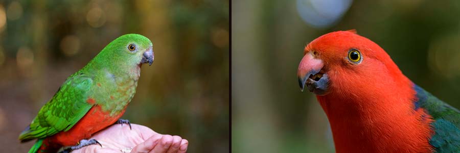 Sie weisen einen starken Geschlechtsdimorphismus auf, d.h. die Geschlechter haben ein recht unterschiedlich gefärbtes Gefieder: Das Männchen ist rot mit grünen Schwingen (siehe Foto oben), das Weibchen ist grün mit rotem Bauch.