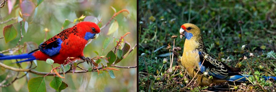 Verschiedene Rassen des Pennantsittichs: links weit verbreitet: Platycercus elegans elegans , rechts im Outback Victorias: P.e. flaveolus